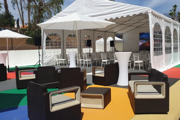 Contamos con una amplia gama de mobiliario y carpas de diseño moderno y funcional. Nos adaptamos a la temática y necesidades de tu evento, ya sea en interiores o exteriores, asegurando que el espacio sea cómodo, estético y acorde a la ocasión. Nuestras carpas son perfectas para eventos al aire libre, brindando protección y estilo a partes iguales.